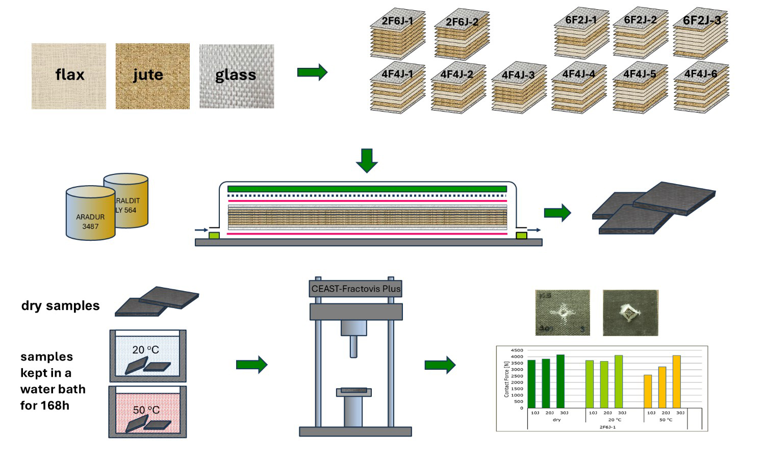 Natural fiber-reinforced composites, whose use is increasing daily in the building, automotive, and aerospace industries, are subjected to low-velocity impact loads in indoor applications. In most impact-exposed applications, increasing impact resistance through the hybrid use of different natural fibers is a frequently used solution. In this study, the impact resistance of hybrid composites reinforced with flax and jute fabrics was investigated in dry and water-absorbed conditions. The stacking layouts, the number of jute and flax fabric layers, and the type of fabric on the impact surface have been observed to affect the impact resistance of dry composites. Increasing the number of flax fabric layers increased water absorption. Although water absorption reduces the impact resistance of composites, it was also observed that impact damage is reduced at 20 J impact energy in some stacking layouts. The study results show that natural fiber-reinforced hybrid composites, produced with appropriate reinforcement elements and stacking layouts to enhance impact resistance, have the potential to increase their applicability in automotive and building sectors, where lightness and cost are key considerations.