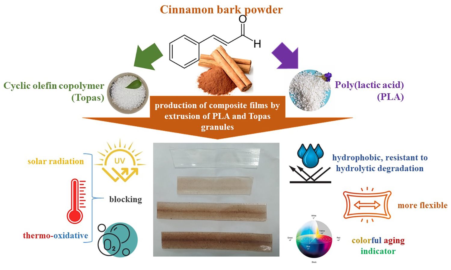 The growing focus on sustainability, eco-friendly technologies, decarbonization, and reducing carbon footprints shapes current industry challenges. This article reviews the potential of cinnamon as a bio-additive for polymer stabilization in packaging. Samples were prepared from ethylene-norbornene copolymer (Topas), a cyclic olefin copolymer known for purity, transparency, and low gas permeability, and poly(lactic acid) (PLA), a bio-based alternative to petroleum plastics. Cinnamon powder was added in 0.5, 1.0, and 1.5 wt%. After solar and thermo-oxidative aging, hydrophobicity, chemical composition, mechanical, and color properties were analyzed. Results showed higher hydrophobicity and resistance to hydrolytic degradation due to reduced water penetration. PLA, normally brittle, became more flexible, with 0.5 wt% cinnamon showing optimal performance after 100 h of solar aging, similar to Topas composites. Overall, PLA and cyclic olefin copolymer (COC) films with cinnamon improved durability, extended food shelf life, and acted as natural color indicators of material aging.