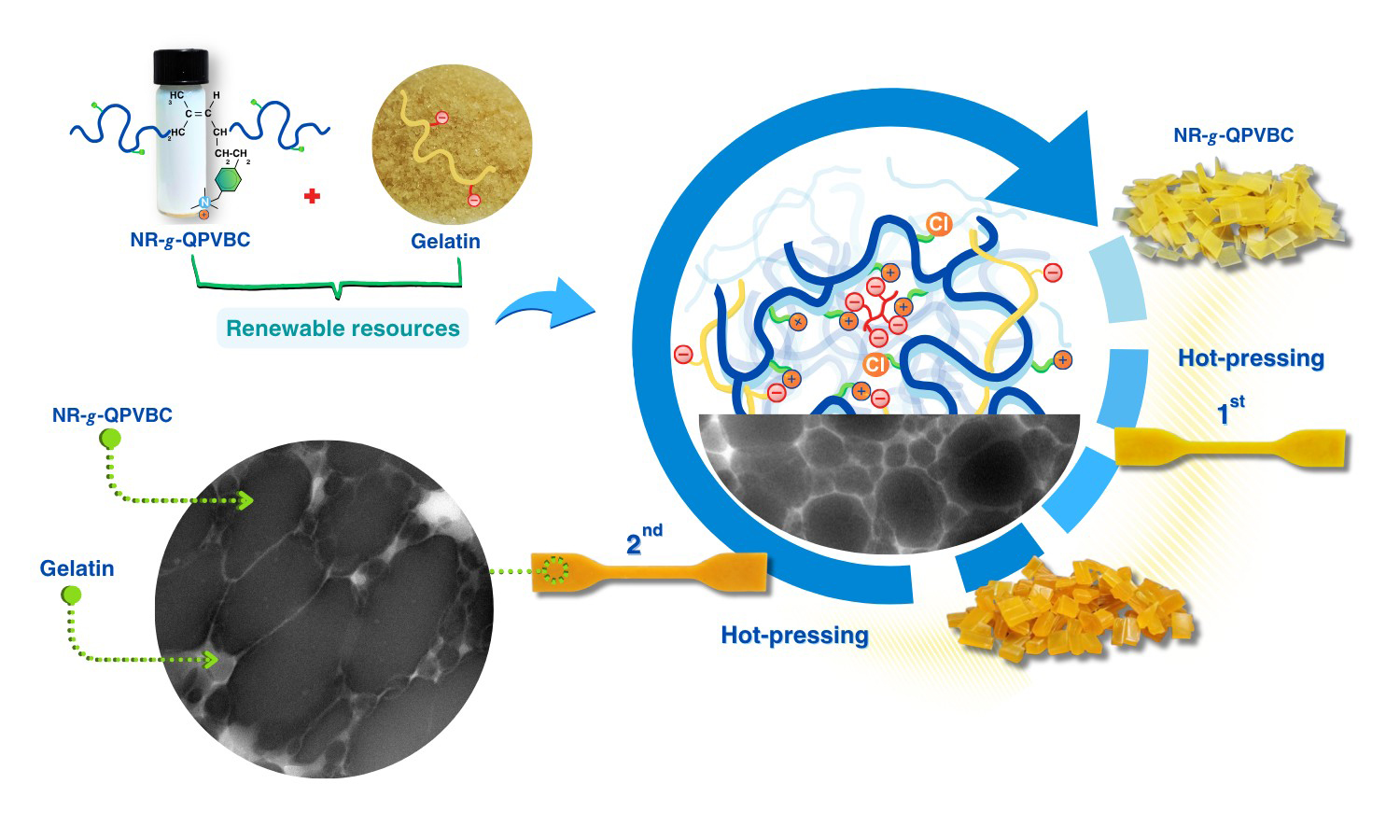 The present study has proposed a straightforward method to improve the reprocessability of modified natural rubber (NR) by blending it with gelatin (GT). The reprocessable characteristics of these blends were evaluated based on their remolding capabilities and mechanical recovery performance. In this method, poly(vinylbenzyl chloride) (PVBC) was first grafted onto NR chains to create graft copolymers known as NR-g-PVBC. The benzyl chloride groups in the graft copolymers were subsequently converted into quaternary ammonium groups, referred to as NR-g-QPVBC. This modification enabled ionic crosslinking when NR-g-QPVBC reacted with ethylenediamine tetraacetic acid. Blends were created by incorporating GT powder into the NR-g-QPVBC latex. The optimal loading level of GT was determined to be 30 wt%, as the resulting film exhibited the highest recovery of tensile properties. Initially, the film's tensile strength was measured at 15 MPa. After being remolded at 160 °C, the tensile strength decreased to 9.3 MPa, resulting in a recovery rate of 60.7% and withstanding a tensile strain of 144%. Although the NR-g-QPVBC/GT films could be remolded, their tensile properties declined with increasing remolding cycles. Therefore, this work demonstrated a practical method for producing NR-based films that could be reshaped through hot-pressing after being formed into products, increasing their reusability.
