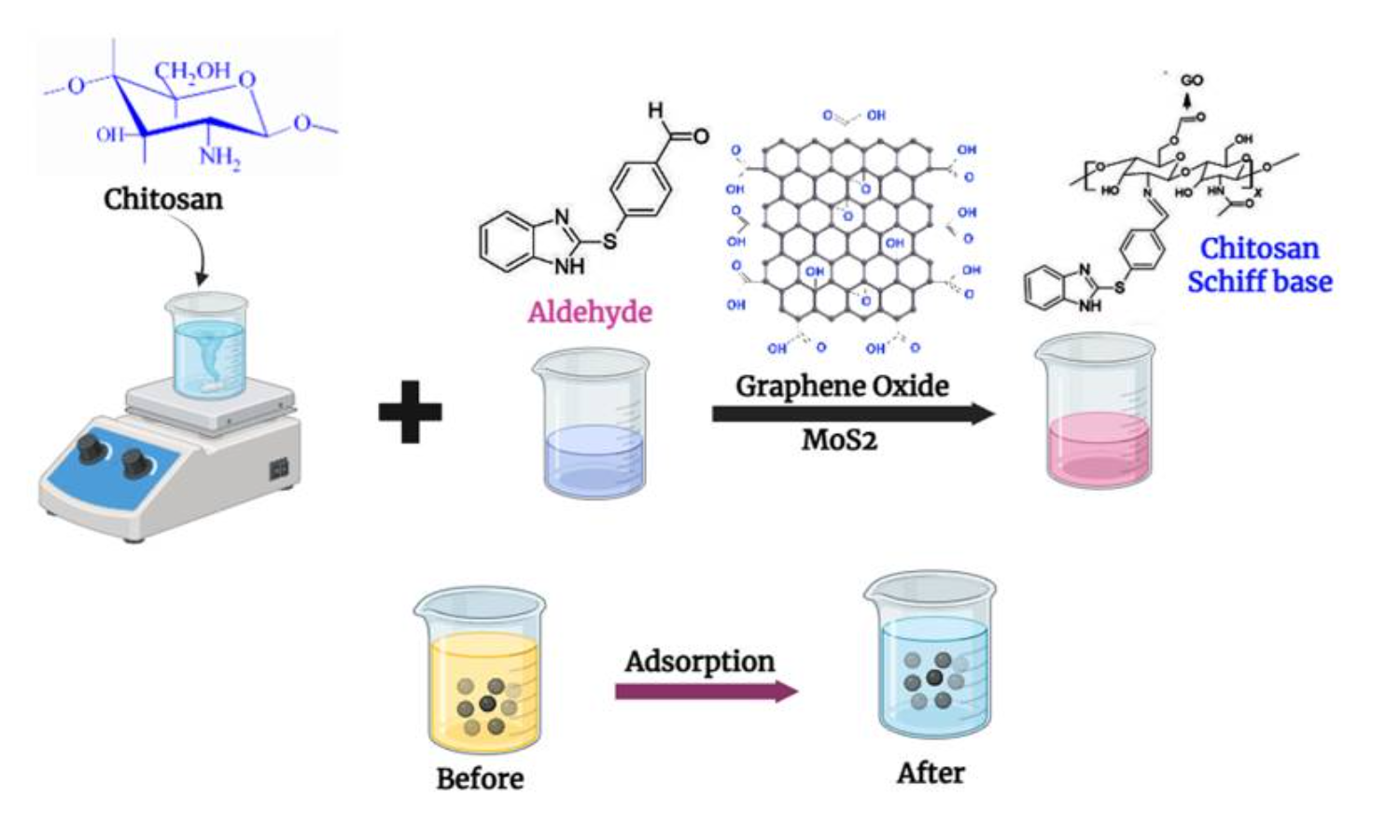 In this work, we have developed a novel absorbent material using chitosan (CS), and further it was structurally modified via reaction with thiocarbaldehyde, forming a Schiff base intermediate. Simultaneously, graphene oxide was functionalized at the C-6 position of CS through an effective esterification process and composited with the incorporation of molybdenum disulfide (MoS2) nanoparticles to synthesize a hybrid adsorbent material. The resulting material was characterized using Fourier transform infrared spectroscopy (FTIR), thermogravimetric analysis (TGA), X-ray diffraction (XRD), and scanning electron microscopy (SEM). The synthesized adsorbent was subjected to the adsorptive removal of Cu(II) and Cr(VI) ions from dilute solutions. The maximum uptake of 66.66 mg/g for Cu(II) and 76.92 mg/g for Cr(VI) were recorded during the adsorption process, further following pseudo-second-order kinetics adsorptive nature and fitted well with the Langmuir isotherm model. Desorption studies indicated the material’s reusability, and the thermodynamic studies indicated a spontaneity with an endothermic adsorptive nature. These studies highlight the material’s potential as an effective adsorbent as a sustainable approach for efficient environmental remediation.