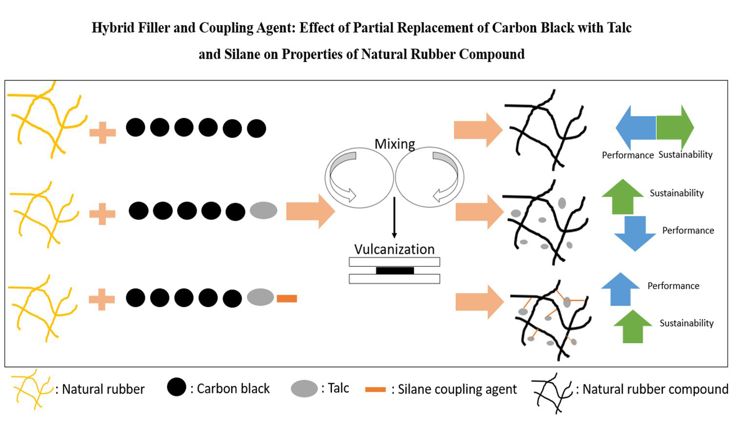 This study investigates a sustainable hybrid-filler strategy for natural rubber (NR) compound by partially replacing petroleum-based carbon black (CB) with talc and introducing a silane coupling agent to mitigate interfacial incompatibility. Compounds containing CB, CB+talc and CB+talc+increasing silane were produced via two-stage mixing and characterized for morphology (dispersion/mapping), curing and flow behavior (differential scanning calorimetry DSC/moving die rheometer, MDR/Mooney), crosslink density (Flory–Rehner), physical–mechanical properties, dynamic performance (Payne effect/heat build-up/tension–fatigue), and thermal stability (aging/thermogravimetric analysis,TGA). Talc reduced the compound viscosity, offering processing benefits. The swelling test indicated that talc decreased crosslink density, but silane recovered it, forming covalent linkages. Tensile strength and elongation at break were improved without altering hardness. Dynamically, talc increased heat build-up, whereas silane inverted the trend and reduced the temperature rise gradually from 41.5 to 29.4°C at 2 phr. Fatigue life was improved with talc (~10%), and further with silane (up to 36% at 2 phr), highlighting a favorable stiffness–fatigue balance with compatibilization. Overall, partial CB replacement by talc, in combination with silane, delivers meaningful sustainability gains with improved dynamic performance while preserving key mechanical properties of NR compounds.