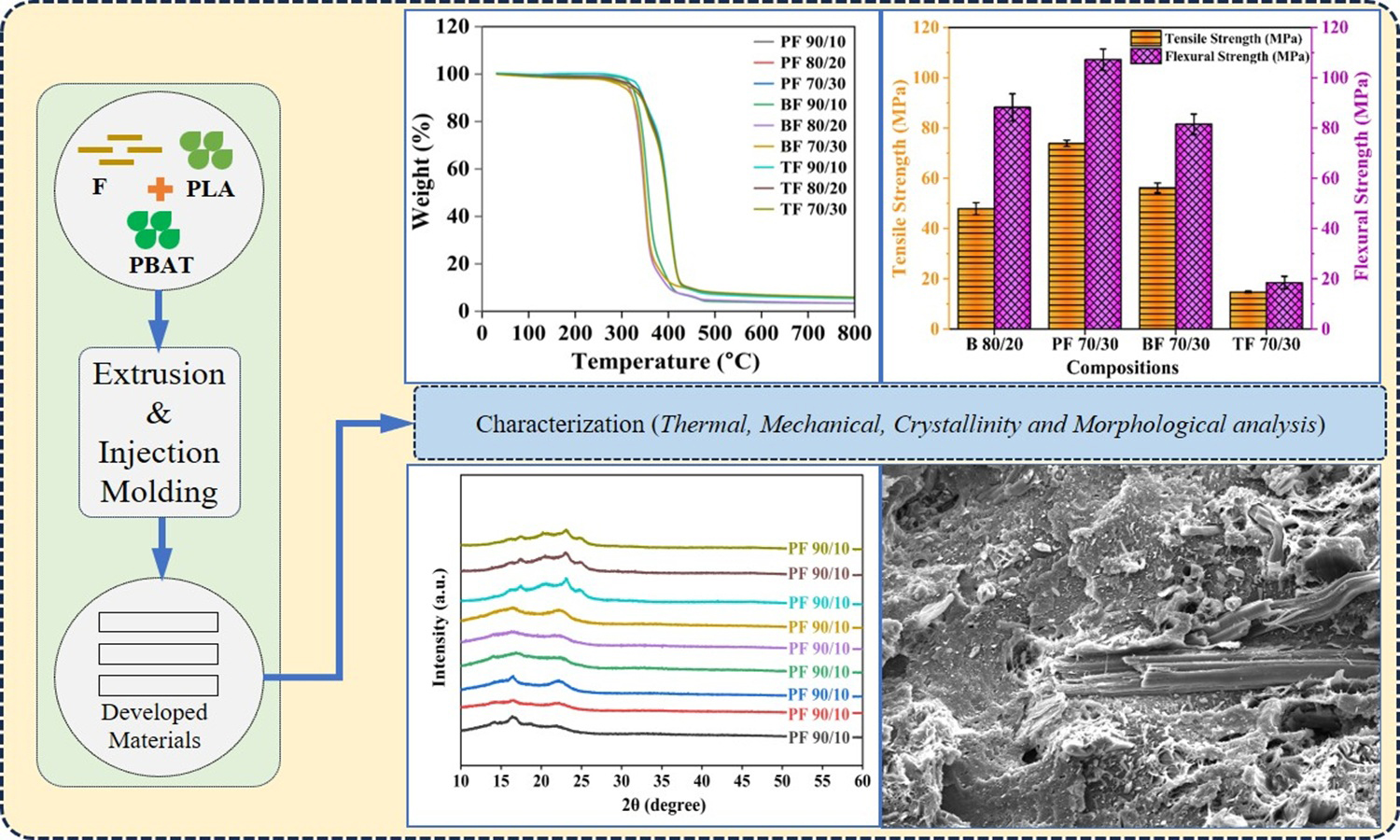 The current experimental investigation presents a comparative evaluation of selected biodegradable polymer blends and their composites, focusing on their material properties. Two biopolymers, polylactic acid (PLA) and polybutylene adipate-co-terephthalate (PBAT), along with pineapple fibers (F), as bio-reinforcement were taken for the analysis, which was conducted in two stages: During first stage, PBAT was melt-blended with PLA in varying weight fractions (10, 20, 30, 40, and 50 wt%) to produce PLA/PBAT blend (B) and in second stage, PLA, PBAT, B 80/20 blend were reinforced with pineapple fiber (10, 20, and 30 wt%). The samples were fabricated using extrusion-injection molding. The samples were characterized for density, thermal degradation, crystallinity, and mechanical behaviour. Among the blends, the optimal B 80/20 combination exhibited tensile strength, flexural strength, and elongation at break of 47.9±2.4, 88.2±5.4 MPa, and 330.6±10.47%, respectively. Results indicate that the PLA-based composites (PF) exhibit significantly better density, tensile strength, and flexural strength as compared to neat polymers, blends, blend-based composites (BF), and PBAT-based composites (TF). Among the PF composites, the PF 70/30 composite demonstrated superior performance, with maximum tensile and flexural strength values of 73.9±1.3 and 107.1±4.3 MPa, respectively.