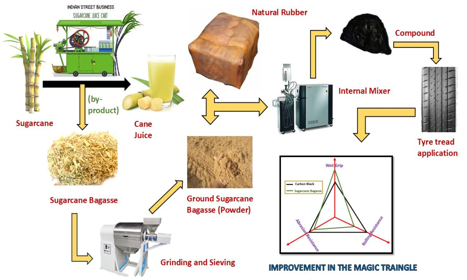 Ground sugarcane bagasse (GSB), an agro-waste rich in lignocellulosic components, was studied as a sustainable bio-filler in natural rubber (NR) tread compounds to lessen reliance on petroleum-derived carbon black (CB). A control formulation with 45 phr CB was compared to hybrid formulations with 40, 35, and 30 phr CB mixed with 5, 10, and 15 phr GSB. Tensile strength 13.1 MPa, elongation at break 700%, and hardness 67 Shore A were all optimally balanced by the compound containing 10 phr GSB (S2), while also exhibiting good cure behavior and thermal stability. Improved tire performance characteristics were confirmed by a dynamic mechanical study, which showed that tan δ at 60 °C decreased by 8.0% (resulting in lower rolling resistance) and increased by 3.9% (improving wet traction) at 0°C. The Payne effect showed improved filler dispersion as a result of GSB partially replacing CB. The results show that appropriately dispersed GSB can partially reinforce NR, enhancing energy efficiency and sustainability. However, larger GSB loadings decrease modulus, tear strength, and abrasion resistance due to lower interfacial adhesion and the presence of micro-voids. According to this study, pulverized sugarcane bagasse shows promise as an environmentally friendly filler for green tire applications, promoting the circular economy and lowering the carbon footprint of rubber compounding.