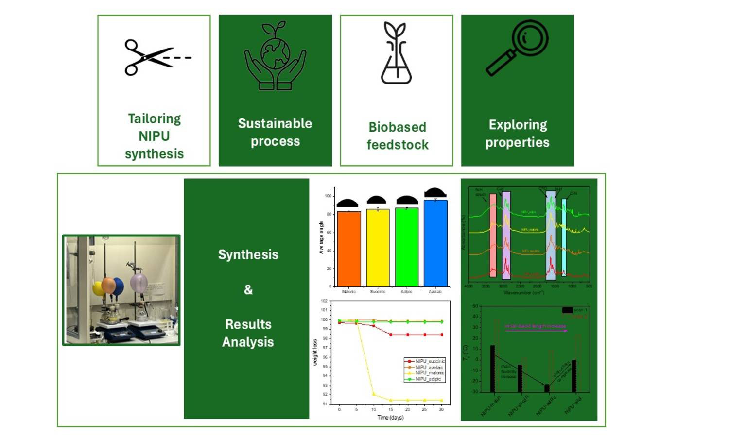 In recent decades, numerous efforts have been dedicated to the investigation of eco-friendly non-isocyanate polyurethanes (NIPUs) as alternatives to conventional polyurethanes (PUs). Since isocyanates are classified by the EU as hazardous and toxic compounds, NIPUs offer a promising route to mitigate isocyanate-related health risks as well as other environmental concerns associated with traditional PU synthesis. In the present study, we report the synthesis as well as the detailed structural and thermal characterization of a new series of fully biobased non-isocyanate polyurethanes (NIPUs) based on aliphatic dicarboxylic acids of different chain lengths. The NIPUs were prepared via a two-step polyaddition reaction involving glycerol carbonate and diamine. Their synthesis enables a sustainable pathway to tailor NIPUs’ physicochemical properties via diacid structure control. Studies of their structure, thermal behavior and trends, morphological, and hydrolytic findings confirmed strong diacid chain length dependence on glass transition temperature (Tg ~13, 0, ‒5 and –23 °C), molecular weight, surface wettability, and enzymatic degradability. Short-chain diacids yielded NIPUs with rapid hydrolytic degradation, while their longer-chain analogs were hydrophobic and thermally stable. Contact angle measurements (~75–85°) also confirm these trends. The tunable properties position these materials among strong candidates for biomedical applications.