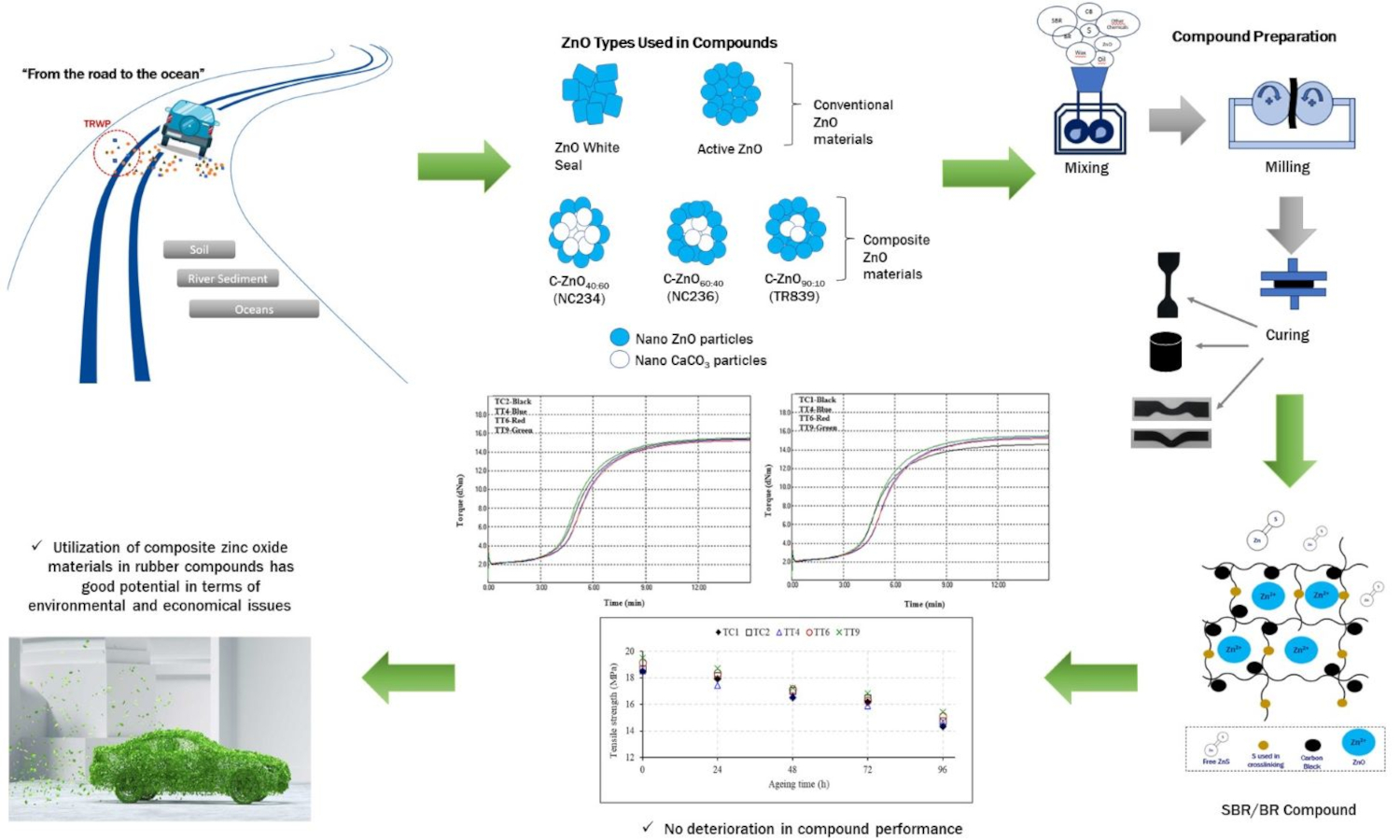 Zinc complexes have a considerable impact on human health and the environment, especially on aquatic wildlife. One of the primary sources of zinc release to the environment is worn rubber particles from tires. The environmental footprint of zinc oxide (ZnO) during production, use, and landfilling has prompted researchers to reduce its use in rubber formulations due to ecological and economic concerns. In this study, composite ZnO materials where ZnO particles are coated on precipitated calcium carbonate (CaCO3) are used in styrene butadiene rubber/butadiene rubber (SBR/BR) compounds, and their performance is compared with white seal ZnO and active ZnO. Trial compounds are prepared on a laboratory scale using composite ZnO materials with ZnO:CaCO3 ratios of 40:60, 60:40, and 90:10, and control compounds with white seal and active ZnO. All compounds are tested to evaluate their curing and physico-mechanical properties. It is observed that the surface area of ZnO plays an essential role in crosslink density and, hence, compound performance. Trial materials have no negative effect on the curing and mechanical properties of the compounds. Thus, it is concluded that composite ZnO materials can be used as alternatives to both white seal ZnO and active ZnO. They have environmental and economic advantages due to their lower ZnO content. The compound recipe has the potential to be used for tire tread compounds.