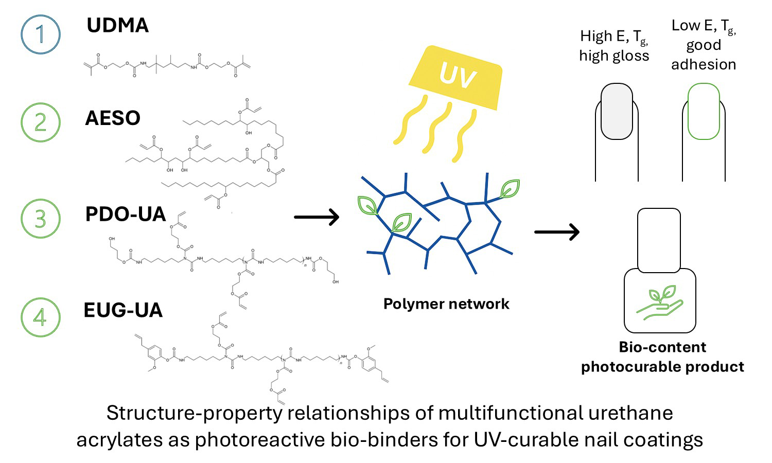 This study investigates the structure–property relationships of multi-functional urethane acrylate resins designed as photoreactive binders for UV-curable nail coatings. Four systems were examined: a commercial resin urethane dimethacrylate (UDMA), a bio-based acrylated epoxidized soybean oil (AESO), and two newly synthesized bio-based urethane acrylates derived from 1,3-propanediol (PDO–UA) and eugenol (EUG–UA). Photopolymerization kinetics were analyzed by realtime FTIR, while the properties of the cured coatings were also determined. The mechanical and thermal behavior of selfsupporting polymer films was evaluated by tensile testing and DSC analysis. The UDMA network exhibited the highest crosslink density, reflected in its high modulus (≈0.5 GPa), tensile strength (≈15 MPa), and Tg (≈60°C), making it suitable for use as a top coat. AESO showed moderate stiffness and flexibility, whereas PDO–UA and EUG–UA formed soft, low-Tg (–12 and –17°C) and highly deformable networks typical of elastomeric materials. The combined mechanical and thermal results confirmed that crosslink density strongly governs coating performance and applicability. This study demonstrates that blending UDMA with bio-based oligomers enables the design of sustainable, UV-curable nail lacquers with an optimal balance of hardness, flexibility, and adhesion to the natural nail plate.