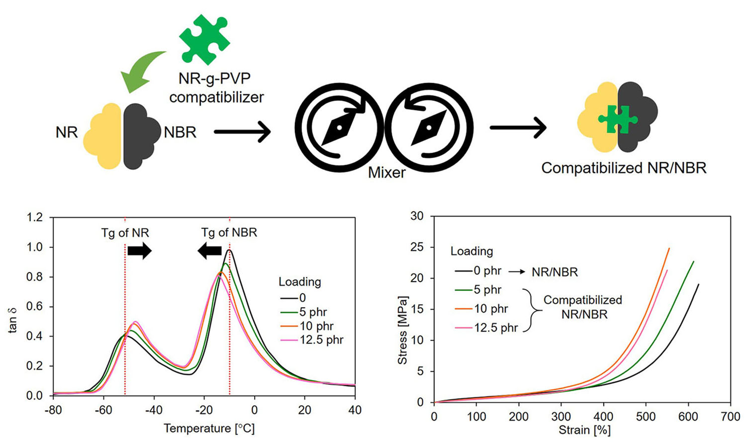 Natural rubber (NR) and acrylonitrile butadiene rubber (NBR) are typically incompatible due to differences in their polarity, which causes poor mechanical properties. In this study, a new type of compatibilizer, namely G10 or poly(vinyl propionate)-grafted natural rubber (NR-g-PVP) containing 10 wt% PVP, is employed to improve the compatibility in 50/50 blends of NR and NBR. The results show that G10 promotes the compatibility and shifts the glass transition temperatures (Tg) of NR and NBR towards each other. This indicates that G10 interacts with both NR and NBR phases. The improved compatibility resulted in a more homogeneous blend with smooth surface morphology. The mechanical properties of the blend, including 300 and 500% moduli, tensile strength, and tear resistance, increased with G10 content up to 7.5 phr. The highest tensile strength of the NR/NBR blend was achieved with 7.5 phr of G10 compatibilizer, showing an improvement of approximately 40.7% over the control sample. The results clearly revealed that NR-g-PVP can be utilized as an effective compatibilizer in NR/NBR blends.