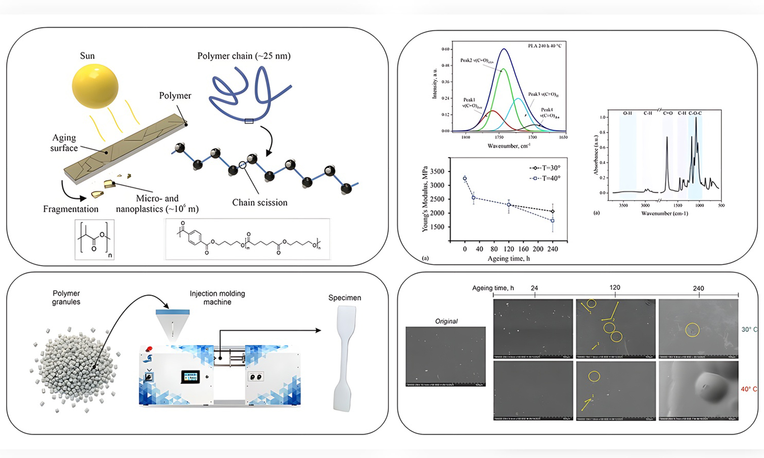 This article is devoted to the study of the degradation of two widely used biodegradable polymers, polylactic acid (PLA) and poly(butylene adipate-co-terephthalate) (PBAT), which are in demand in packaging, medicine, and agriculture. The effect of ultraviolet radiation (UV) at elevated temperatures on polymer ageing was investigated for 24, 120, and 240 h using a specially designed setup. Scanning electron microscopy, Fourier transform infrared spectroscopy, and tensile testing were employed to provide a comprehensive assessment of changes. PLA showed rapid degradation: after 120 h, its surface developed cracks and voids, and at 240 h, it became heavily damaged with cavities. PBAT degraded more gradually: at 240 h, large cracks and cavities were observed. For PLA, early ageing led to a shift and broadening of the carbonyl band, reflecting disorder and ester scission. For PBAT, a decrease in the intensity of the carbonyl shoulder and a slight shift of the main peak at elevated temperature indicated phase redistribution and the formation of new functional groups. Mechanically, PLA exhibited a sharp loss of strength and ductility in the first day of ageing, while PBAT showed greater stability, with slower reductions in stiffness and strength but a strong temperature-dependent decline in elongation. These findings are important for guiding the design of biodegradable polymers with improved durability.