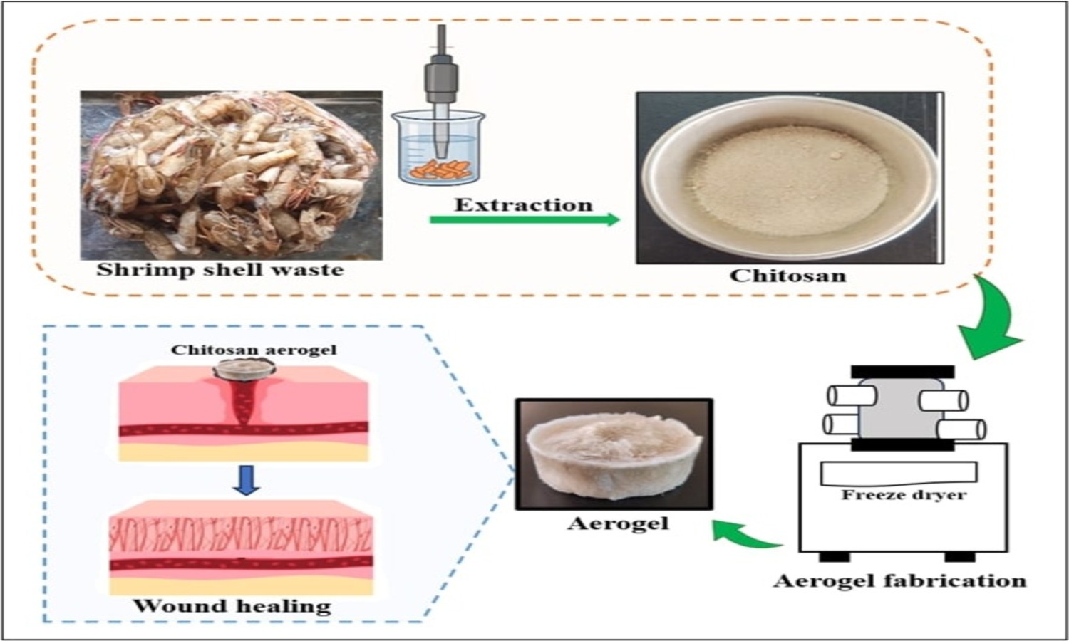 This research presents an eco-friendly approach for extracting chitosan from shrimp shell waste through ultrasound-assisted extraction (UAE) to prepare biocompatible aerogel scaffolds for biomedical applications. The study investigates the influence of various ultrasonic treatment times (10, 20, 30, 40 min) on the yield and structural and physicochemical properties of the extracted chitosan via characterization using Fourier-transform infrared spectroscopy (FTIR), scanning electron microscopy (SEM), and thermogravimetric analysis (TGA). Among the tested conditions, the 30 min UAE-treated chitosan aerogels showed optimal porosity and structural integrity. Biocompatibility of the aerogels was evaluated, and the results confirmed their non-cytotoxic nature. The bioactivity of the chitosan aerogels was evaluated in terms of their in vitro wound closure ability and antibacterial properties. The aerogels demonstrated a wound closure rate of around 51% after 72 h, significantly higher than the untreated control (37%). In addition, they exhibited clear antibacterial activity against Escherichia coli and Staphylococcus aureus. This sustainable extraction and fabrication method not only adds value to marine waste but also produces functional biomaterials with potential applications in wound healing, tissue engineering, and regenerative medicine, supporting global efforts toward sustainability and circular bioeconomy.