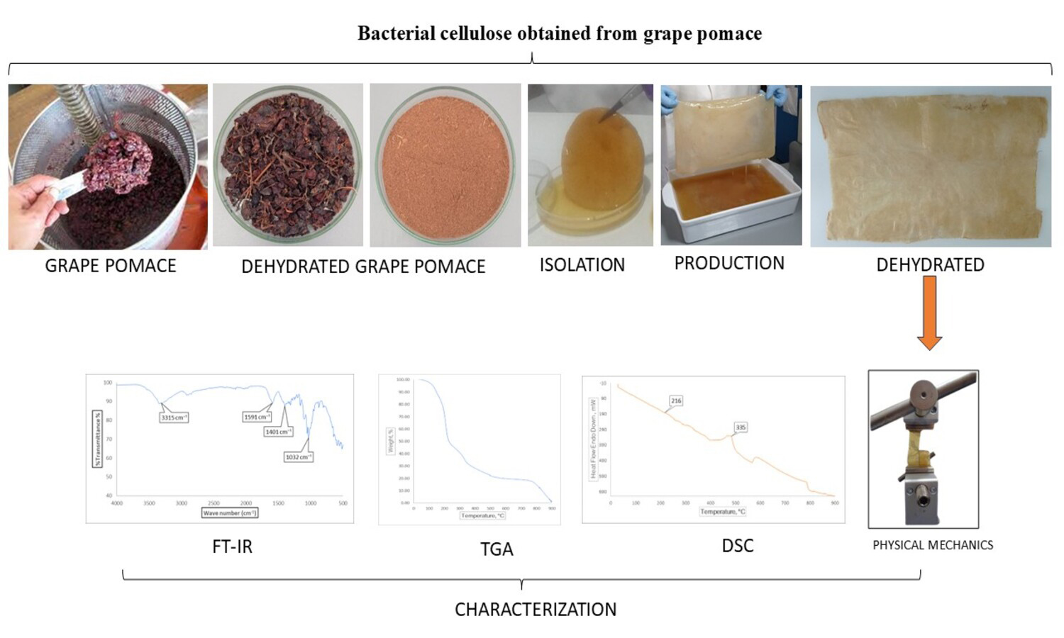 Bacterial cellulose (BC) is an eco-friendly biopolymer with outstanding structural and functional properties, offering promising applications in sustainable packaging and bio-based materials. In this study, we demonstrate the feasibility of producing BC via spontaneous fermentation, using grape pomace supplemented with sucrose as the sole carbon source, nutrient substrate, and microbial inoculum, without the addition of commercial strains or nitrogen supplements. Fermentation was conducted under static conditions, yielding biofilms with stable structural characteristics and BC production of up to 14.1 g/L, thereby confirming the efficiency of this low-cost, residue-based process. The films obtained exhibited well-organized polymeric networks, with thermal stability in the range of Tg ≈ 159–266 °C and mechanical resistance comparable to or higher than conventional biopolymers. Characterization confirmed reproducible chemical profiles, thermal stability, and measurable variation in mechanical performance, with a tensile strength ranging from 0.0001 to 105 MPa and an elongation at break of 15±5%. The process highlights a resource-efficient and sustainable pathway, adaptable to rural contexts and aligned with circular economic principles. While minor variations among replicates reflected the intrinsic variability of biological systems, mean values and standard deviations demonstrated reproducible physicochemical and mechanical properties. These findings demonstrate that BC derived from agro-industrial residues can be produced under simple, low-input conditions, opening opportunities for scalable valorization in functional and sustainable materials.