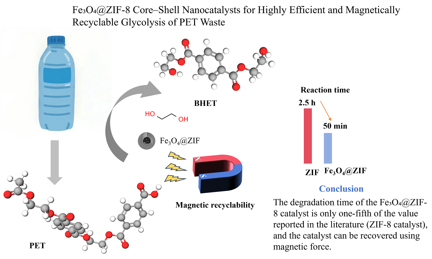 In this study, magnetic core-shell Fe3O4@ZIF-8 was synthesized via a hydrothermal method and applied to Polyethylene terephthalate(PET) degradation. The catalytic degradation of PET by Fe3O4@ZIF-8 was carried out under atmospheric pressure, yielding high-value bis(2-hydroxyethyl) terephthalate (BHET) monomers. The as-synthesized Fe3O4@ZIF-8 core-shell composites possess hierarchical porosity with tunable nanoscale cavities. SEM and TEM analyses confirmed the core-shell morphology, with nanoparticles having a size distribution of 180–280 nm. The degradation product was identified as a high-purity, colorless, and transparent monomeric BHET through 1H NMR and LC analyses. Based on a series of onefactor experiments and a Box-Behnken experimental design, the optimal process conditions were determined to be an alcoholysis temperature of 200°C, a catalyst dosage of 0.5 wt% (relative to PET mass), a reaction time of 50 min, and an ethylene glycol-to-PET mass ratio of 4.5:1. Under these conditions, the actual BHET yield reached 81.12%, closely matching the predicted value.
