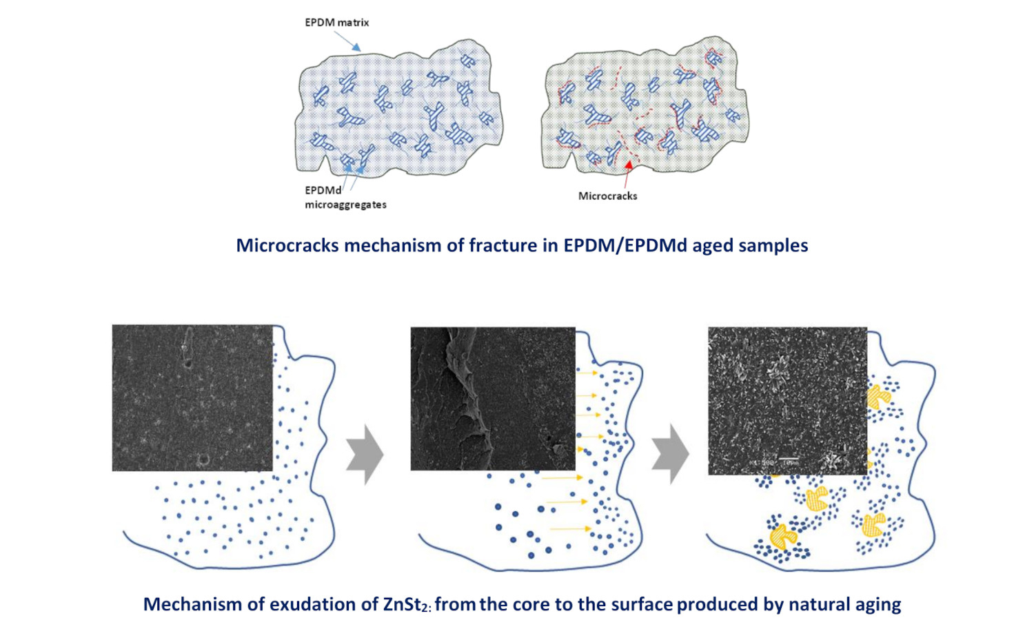 The need to recycle elastomeric waste requires studying its viability in industrial applications. This study investigates the feasibility of recycling elastomeric waste by analyzing whether virgin ethylene-propylene-diene monomer (EPDM) can be replaced by blends of virgin EPDM and thermomechanically and microwave devulcanized EPDM (EPDMd) in industrial applications from the perspective of environmental degradation. Two types of samples were examined: conventional EPDM used to roof membranes, and EPDM blended with different amounts (20, 40, and 50 phr) of EPDMd. Samples were subjected to natural aging in coastal and mountainous environments. Results show that mechanical properties decline with higher EPDMd content and, to a lesser degree, with prolonged outdoor exposure. The coastal climate proved more aggressive than the mountainous one when EPDMd content exceeded 40 phr. Zinc stearate (ZnSt2), a byproduct of vulcanization, was found to influence the evolution of the mechanical behavior. The combined analysis of scanning electron microscopy (SEM), Fourier transform infrared spectroscopy (FTIR), abrasion tests, and thermogravimetric analysis (TGA) provided insights into the degradation processes of these elastomeric blends.