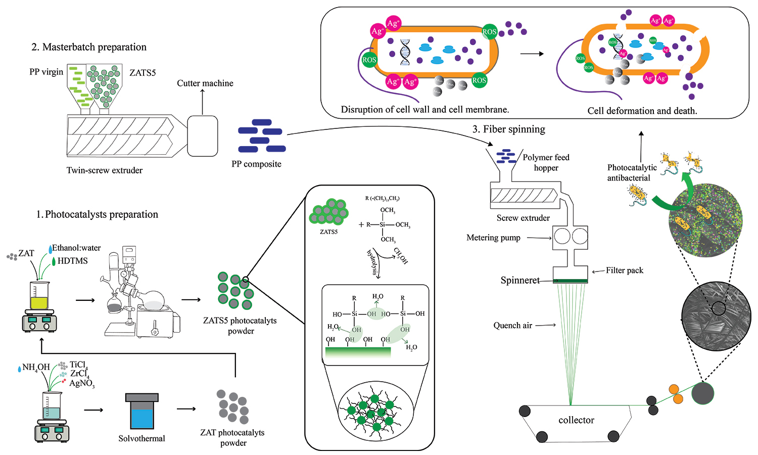 The development of functional antibacterial spunbond fabrics is critical for improving indoor environmental treatment. This study presents the fabrication of polypropylene (PP) fibers embedded with silane-modified Zr/Ag co-doped TiO2 nanoparticles. The Zr (5 mol%) and Ag (3 mol%) co-doped TiO2 nanoparticles were synthesized via a solvothermal method and subsequently modified with 5 wt% hexadecyltrimethoxysilane (HDTMS), referred to as ZATS5. The solvothermal method enables the controlled synthesis of phase-pure, well-dispersed nanostructures and facilitates dopant incorporation in the photocatalysts completely. Additionally, HDTMS surface modification improved compatibility with the polypropylene matrix, enhancing dispersion and interfacial bonding and improving overall composite performance. ZATS5 was incorporated into the PP matrix through melt spinning to produce composite fibers. The minimum of ZATS5 at 1 wt% embedded in spunbond nonwoven composite (PP/ZATS5-1) demonstrated the fiber’s structural integrity and remarkable antibacterial activity. The PP/ZATS5-1 nonwoven fabric achieved 99.98% inactivation of Legionella pneumophila under dark conditions and complete inhibition under visible light. This research offers a scalable and effective strategy for developing antibacterial spunbond nonwoven fabrics with potential applications in medical textiles, as well as air and water purification systems operating under ambient indoor lighting.
