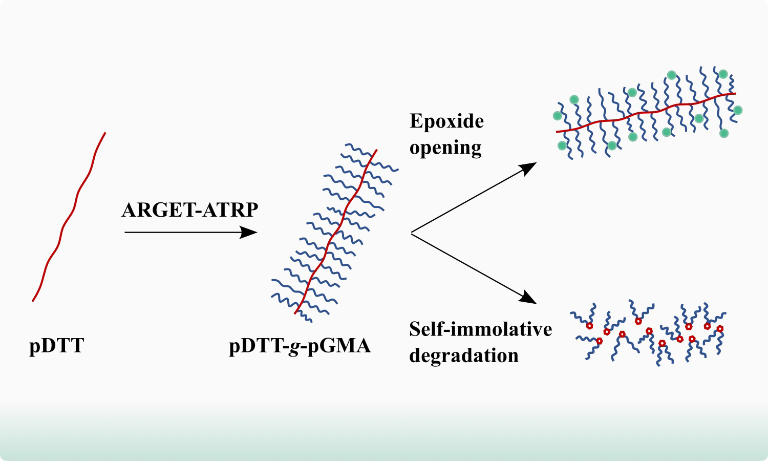 Post-polymerization modification of self-immolative polymers expands the application spectrum of such macromolecular materials. This work demonstrates grafting of poly(glycidyl methacrylate) brushes from a self-immolative poly(DL-dithiothreitol) backbone using activators regenerated by electron transfer–atom transfer radical polymerization (ARGET–ATRP). The polymerization kinetics of the brushes is studied in detail by 1H NMR and size exclusion chromatography, indicating a linear increase in number-average molecular weight. Furthermore, it is demonstrated that the self-immolative properties of the backbone are retained in the bottlebrush polymers by examining the degradation process in solution.