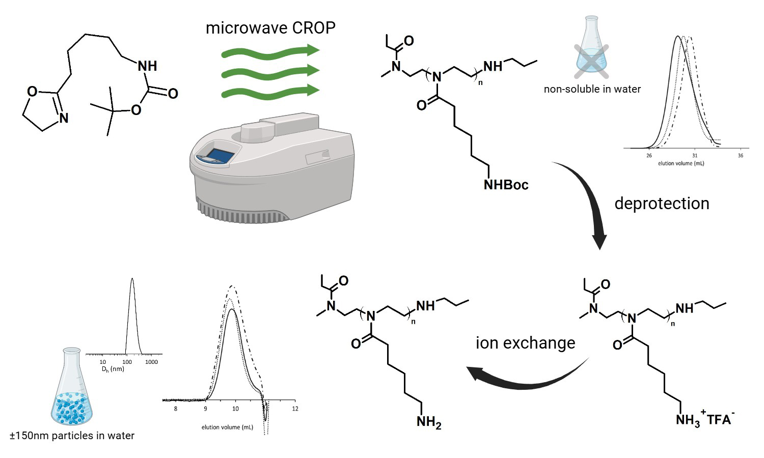 In this study, a series of novel homopolymers based on N-Boc-protected 2-(aminopentyl)-2-oxazoline (P(PentNHBocOx)) were synthesized via microwave-assisted cationic ring-opening polymerization (CROP), achieving high monomer conversions (up to 100%) and low dispersity values (Ð = 1.08–1.30). The resulting polymers were quantitatively deprotected using TFA/DCM, followed by ion exchange to yield amino-functionalized poly(2-oxazoline)s (P(PentNH2Ox)). Comprehensive characterization of the polymers confirmed successful deprotection without polymer degradation, preservation of low dispersity, and the formation of nanoscale aggregates in aqueous solutions falling within the size range of 140–152 nm, suitable, for biomedical applications. Cytotoxicity assays demonstrated that the polymers are non-toxic to human dermal fibroblasts, maintaining cell viability above 70% even at higher concentrations and extended incubation times. These findings highlight the potential of P(PentNH2Ox) as promising, biocompatible candidates for biomedical and nano-therapeutic applications.